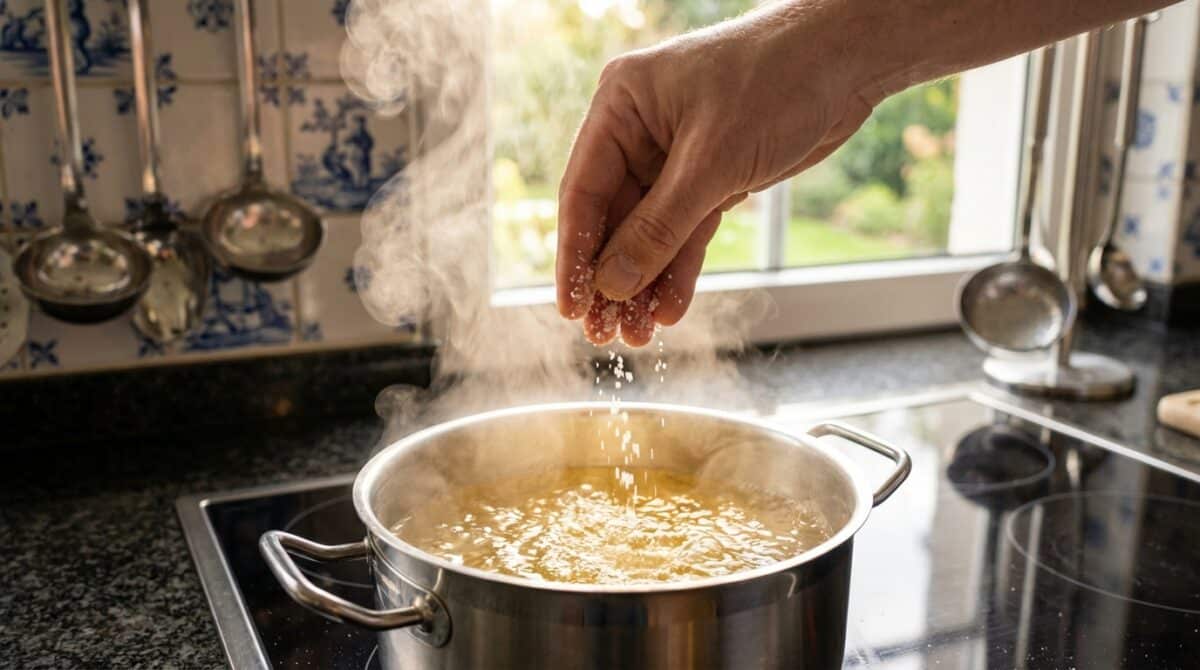 Viele warten, bis das Wasser kocht, bevor sie Salz hinzufügen. Das ist ein Fehler! Wenn das Salz erst im kochenden Wasser landet, löst es sich nicht optimal auf.